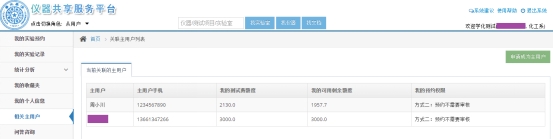 注意,“委托儀器管理員測試”中的選項是儀器所在實驗室下所有的儀器管理員;“測試費來源”列表中顯示的是當前用戶歸入的所有主用戶,用戶選擇一位后,該預約使用的費用將從選擇的主用戶的經費中扣除。
