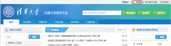 如果是校外用戶,使用chrome瀏覽器登陸清華大學儀器共享平臺,輸入鏈接地址:http://yqgx.tsinghua.edu.cn,打開如圖5所示的頁面,點擊“請登錄”圖標,輸入用戶名和密碼后進入如圖4所示的頁面。