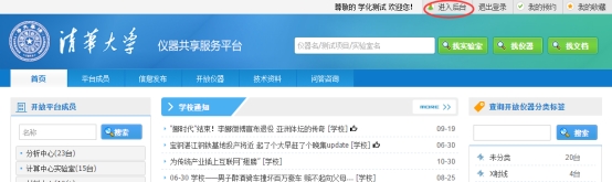 如果是校內用戶,使用chrome瀏覽器登錄清華信息門戶,點擊圖2中的“儀器共享服務平臺”進入儀器共享系統。點擊圖3中的“進入后臺”圖標,用戶進入系統管理頁面,如圖4。
