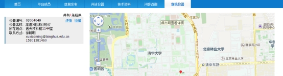方法一:在系統首頁頂部的搜索框內輸入儀器名,點擊“找儀器”按鈕,如圖6,頁面將顯示出相應的查詢結果,如圖7。頁面默認顯示的地圖是查詢結果中的第一個儀器的放置地點。點擊“詳情”鏈接,頁面顯示該儀器的詳細信息,如圖8。