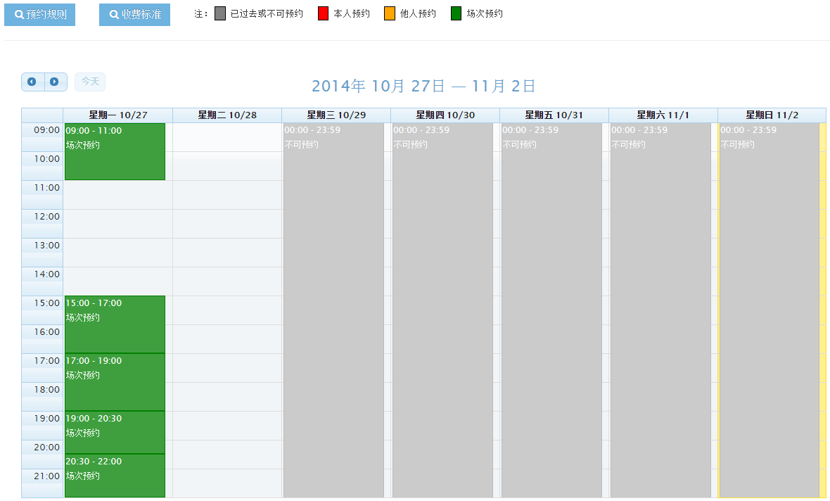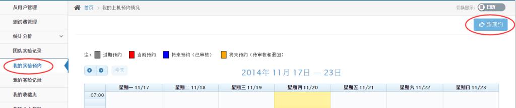 點擊圖17或圖19或圖22中的“上機預約”按鈕,進入如圖23所示的上機預約日歷頁面。其中綠色表示場次預約,預約時間固定;沒有顏色標識的表示可選時間預約,預約時間不固定,用戶可根據需要拖拽相應的時間段預約實驗;灰色表示當前不可預約時段;淺黃色表示當前日期。