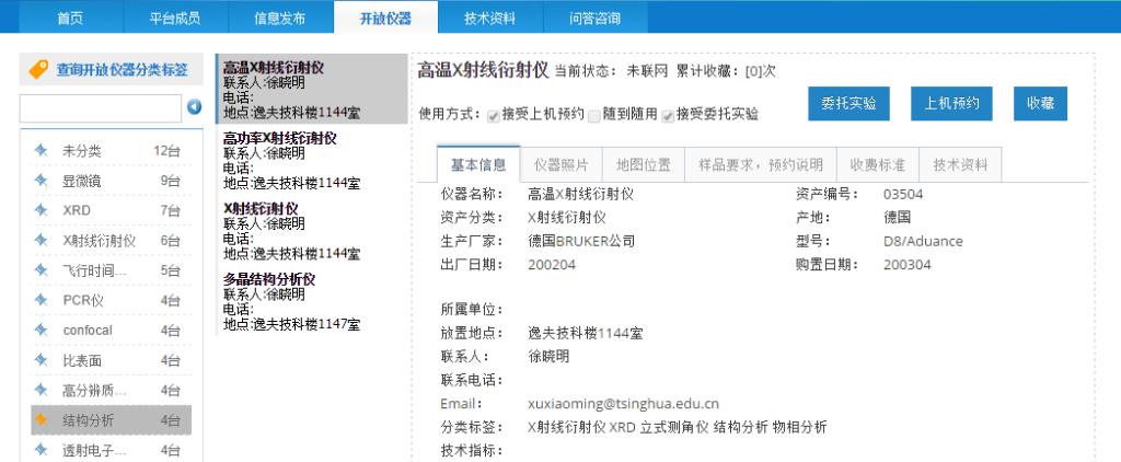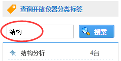 方法二:在系統首頁的右側“查詢開放儀器分類標簽”欄內輸入標簽名,如圖18,選擇查詢結果中所需的標簽,頁面顯示出對應的開放儀器。圖19顯示的是分類標簽中含有‘結構分析’的開放儀器,頁面默認顯示的是第一臺儀器的信息。