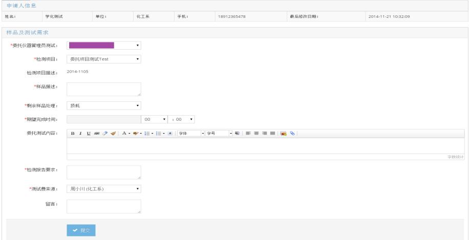 注意,“委托儀器管理員測試”中的選項是儀器所在實驗室下所有的儀器管理員;“測試費來源”列表中顯示的是當前用戶歸入的所有主用戶,用戶選擇一位后,該預約使用的費用將從選擇的主用戶的經費中扣除。