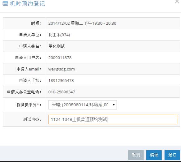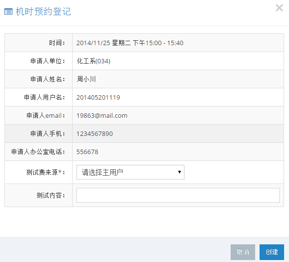 用戶選擇或拖拽預約時間段,系統自動彈出如圖24所示的上機預約申請頁面。注意,“測試費來源”列表中顯示的是當前用戶歸入的所有主用戶,用戶選擇一位后,該預約使用的費用將從選擇的主用戶的經費中扣除。