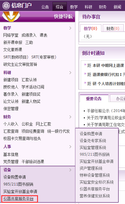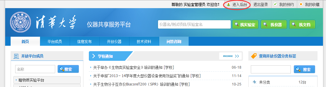 使用chrome瀏覽器輸入個人證號和密碼登錄清華大學信息門戶,點擊圖2中的“儀器共享服務平臺”進入系統。點擊圖3中的“進入后臺”圖標,用戶進入系統管理頁面,如圖4。