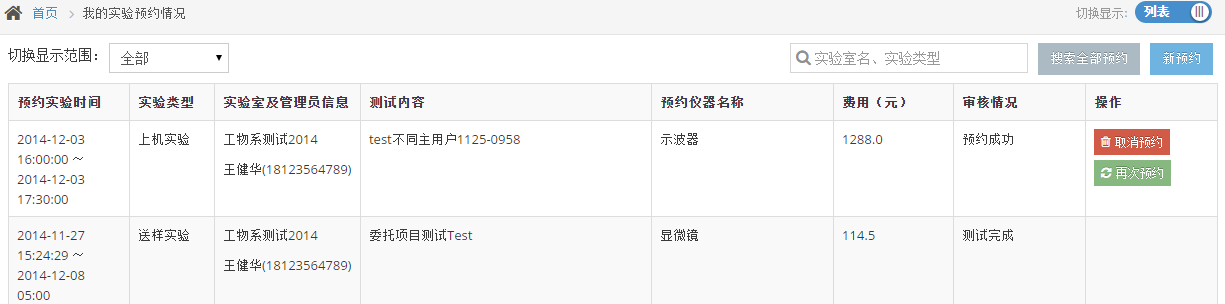 圖20主用戶角色下“我的實驗預約”頁面
