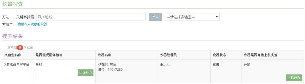 用戶可以根據‘實驗室名’、‘儀器名稱’和‘儀器分類標簽’進行關鍵字查詢,圖22顯示的是‘X射線’的顯示結果。