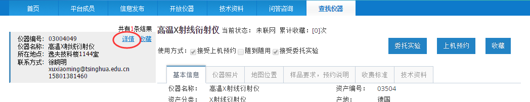 圖17系統首頁查詢結果中某臺儀器的詳細信息