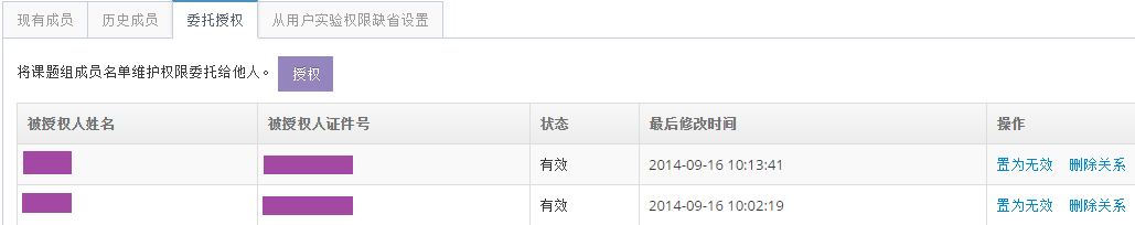 (3)‘與本課題組關系’選擇為有效的從用戶將記錄到“現有成員”列表中,如圖8,選擇為解除的從用戶將記錄到“歷史成員”列表中,如圖9;