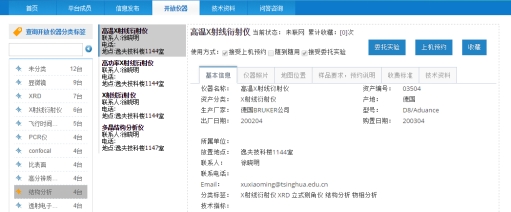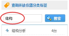 方法二:在系統首頁的右側“查詢開放儀器分類標簽”欄內輸入標簽名,如圖17,選擇查詢結果中所需的標簽,頁面顯示出對應的開放儀器。圖18顯示的是分類標簽中含有‘結構分析’的開放儀器,頁面默認顯示的是第一臺儀器的信息。