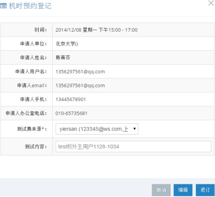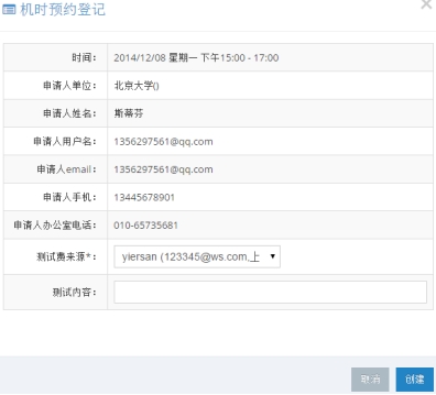 用戶選擇或拖拽預約時間段,系統自動彈出如圖23所示的上機預約申請頁面。注意,“測試費來源”列表中顯示的是當前用戶歸入的所有主用戶,用戶選擇一位后,該預約使用的費用將從選擇的主用戶的經費中扣除。