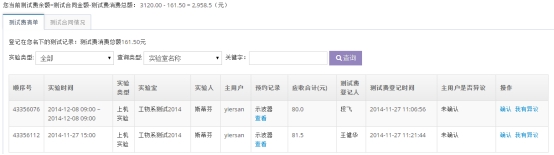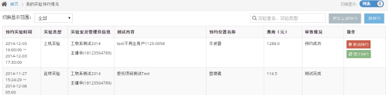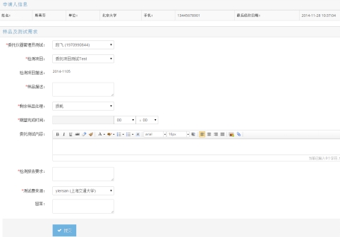 注意,“委托儀器管理員測試”中的選項是儀器所在實驗室下所有的儀器管理員;“測試費來源”列表中顯示的是當前用戶歸入的所有主用戶,用戶選擇一位后,該預約使用的費用將從選擇的主用戶的經費中扣除。