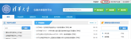 使用chrome瀏覽器登陸清華大學儀器共享平臺,輸入鏈接地址:http://yqgx.tsinghua.edu.cn,打開如圖2所示的頁面,點擊“請登錄”圖標,輸入用戶名和密碼后進入如圖3所示的頁面。
