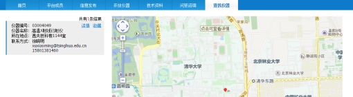 方法一:在系統首頁頂部的搜索框內輸入儀器名,點擊“找儀器”按鈕,如圖14,頁面將顯示出相應的查詢結果,如圖15。頁面默認顯示的地圖是查詢結果中的第一個儀器的放置地點。點擊“詳情”鏈接,頁面顯示該儀器的詳細信息,如圖16。
