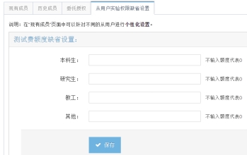 主用戶首次添加用戶前需要設置測試費額度缺省值,點擊圖4中的“從用戶實驗權限缺省設置”標簽,打開圖5所示的頁面。注意,若沒有在此處設置缺省值,主用戶在添加成員時可以逐個指定測試費額度。
