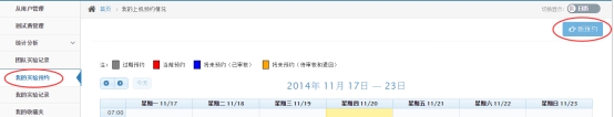 點擊圖16或圖18或圖21中的“上機預約”按鈕,進入如圖22所示的上機預約日歷頁面。其中綠色表示場次預約,預約時間固定;沒有顏色標識的表示可選時間預約,預約時間不固定,用戶可根據需要拖拽相應的時間段預約實驗;灰色表示當前不可預約時段;淺黃色表示當前日期。