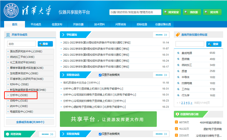 清華大學儀器共享服務平臺 是校實驗室管理處建設的全校科研條件平臺服務系統,分析中心是其成員單位之一。全校開放共享設備的詳細信息、各實驗室的通知公告和各類技術資料等均可查詢。其中最便捷的功能是測試預約和校內繳費。