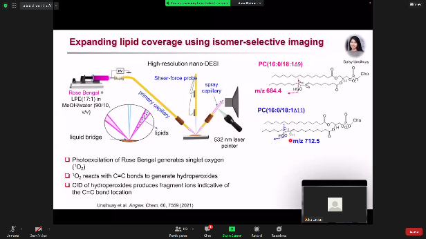 普渡大學的Julia Laskin教授作“利用納噴霧解吸電離質譜法對組織中的生物分子進行高分辨成像”的報告,分享了納噴霧解吸電離法結合單線態氧氣參與的光化學反應實現了脂質C=C異構體的成像以及。