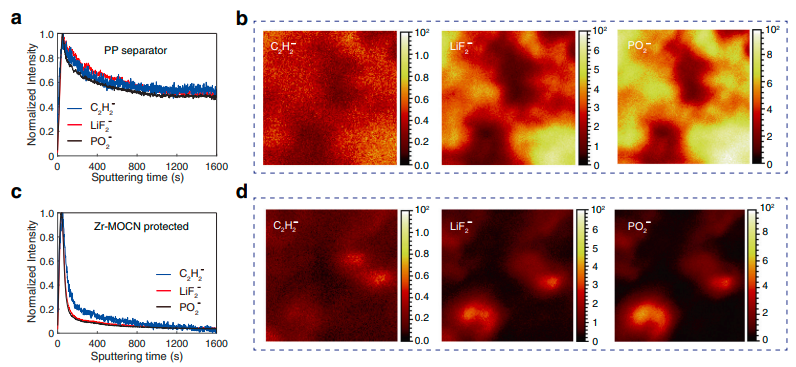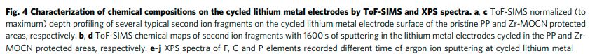 清華大學核能與新能源技術研究院何向明研究員和徐宏副教授課題組通過均勻納米孔隔膜調節電解液溶劑化結構,實現了對于鋰枝晶和副反應的有效抑制。在鋰-鋰對稱電池和以LiNi0.6Mn0.2Co0.2O2為正極的高電壓鋰金屬電池中,經過長時間循環后,不僅能做到完全無鋰枝晶生成,而且由于對副反應的有效抑制,鋰金屬電極甚至仍能保持原有的金屬光澤。本工作制備的均勻納米多孔隔膜(Zr-MOCN@PP)是以商業化常用PP隔膜為支撐,由含金屬內核,甲基丙烯酸配體的團簇(Zr-MOC,)在紫外光照下原位聚合得到的。如何有效的從離子層面去表征反應前后的抑制效果是一個難點,由于TOF-SIMS近年來在鋰電池的表征方面應用廣泛,我們嘗試用原位方法輔助其對表面進行分析;結果如下圖: