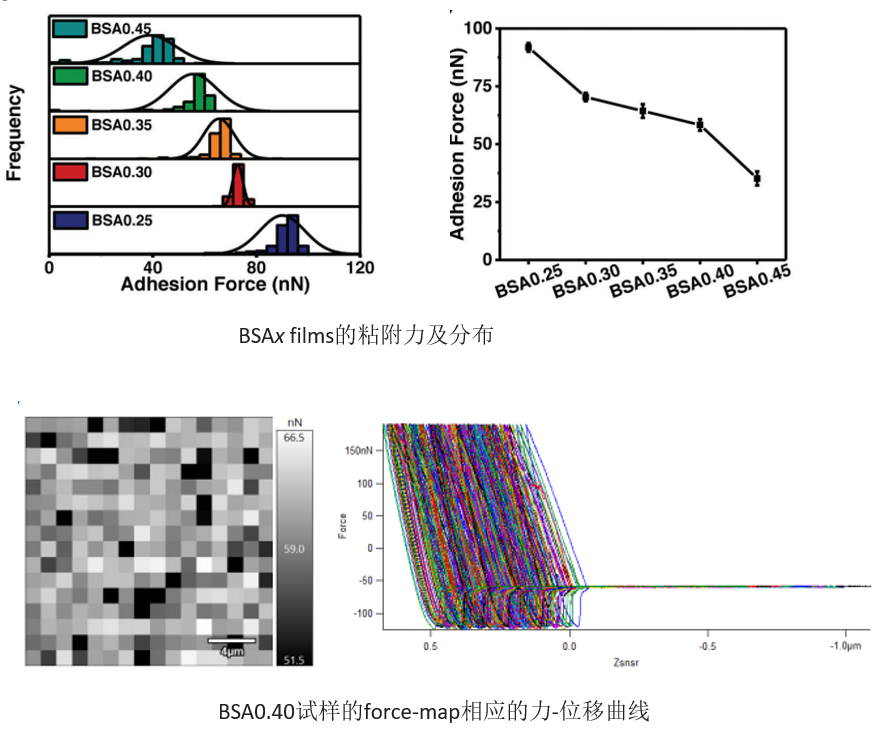 清華大學張希院士團隊徐江飛副研究員、孫鵬博士等開發了一種新型生物基超分子粘合劑(Bio-Based Supramolecular Adhesive,BSA),它以蓖麻油、美左旋多巴和鐵離子為基礎材料,具有出色的粘合性能。這一研究方向將為設計具有出色粘合性能和出色的多次重復使用性的生物基粘合劑提供新的見解。該研究以題為“A Bio-Based Supramolecular Adhesive: Ultra-High Adhesion Strengths at both Ambient and Cryogenic Temperatures and Excellent Multi-Reusability”的論文發表在《 Advanced Science》上。分析中心AFM分析表征了該生物基超分子粘合劑的粘接性能,為粘附力的測試提供了關鍵數據。通過在每個BSAx膜上隨機3個區域上的256個點的力-位移曲線分析粘附力,系統研究了鐵離子濃度x對BSA粘接性能的影響,研究表明:強內聚力或強粘合力并不是形成超強粘合的唯一關鍵因素,只有當粘合力和內聚力共同作用時,才能產生超強粘合力。