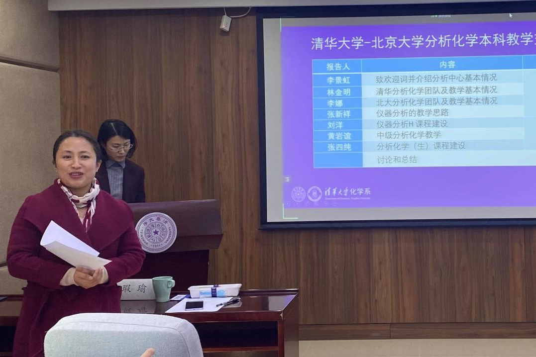 北京大學化學與分子工程學院分析所副所長李娜教授將北京大學化學和分析化學百余年來的歷史沿革與教學傳承娓娓道來,如數家珍般列舉了出版的教材和獲得的榮譽。李老師介紹了北京大學定量分析化學實驗和儀器分析實驗課程在小班授課、英文授課和探索性訓練方面的教學情況。結合多年的教學經驗,在課程構架、課程貫通和分層教學方面分享了自己的思考和體會。李老師特別提到了分析化學家R.W. Murray在1994年的表述“Analytical chemistry is still what analytical chemists do”與各位老師共勉。最后,李老師邀請各位清華的老師到北大交流指導。