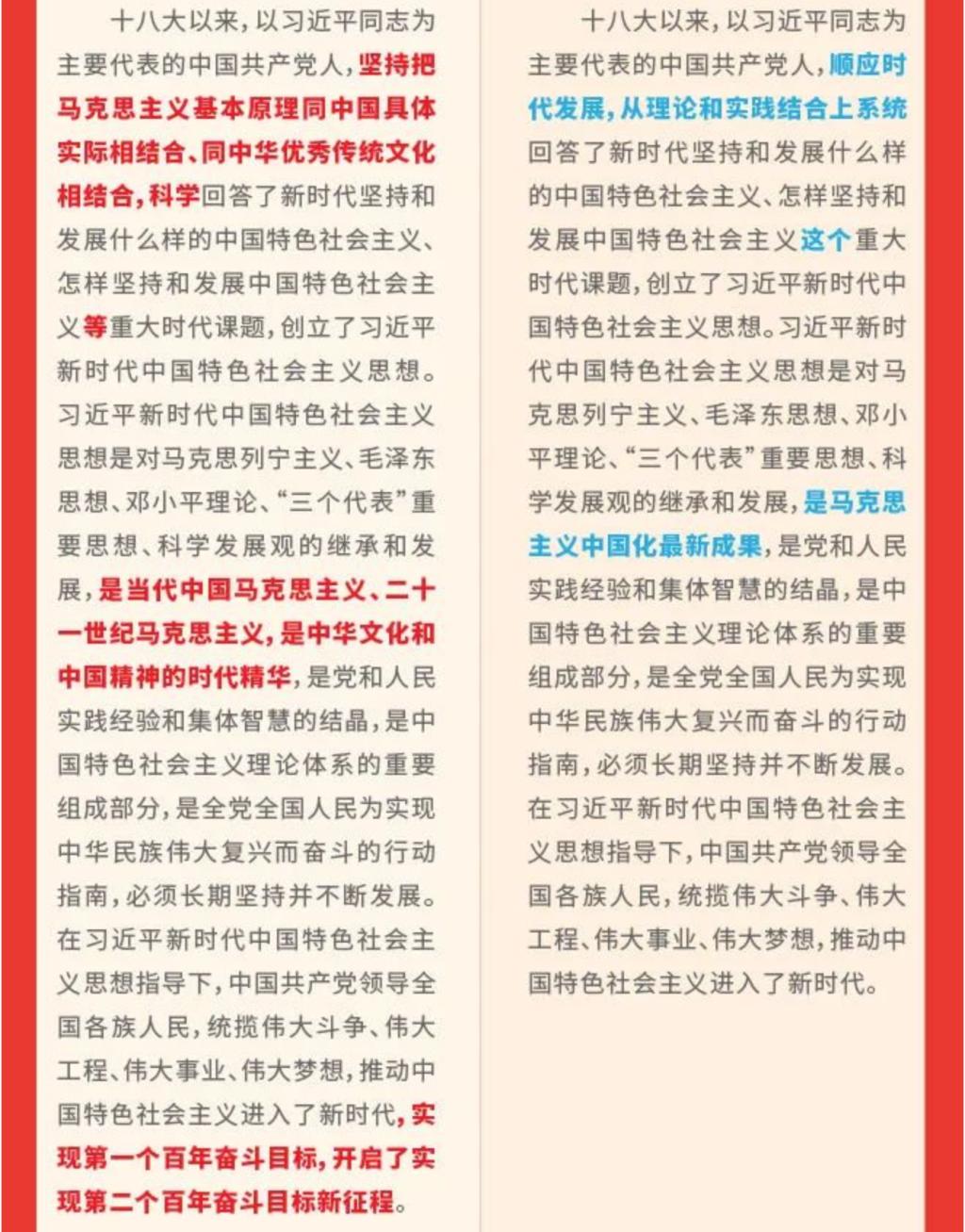 新修改的黨章,把十九屆六中全會通過的《中共中央關于黨的百年奮斗重大成就和歷史經驗的決議》中總結的“十個堅持”列入總綱:堅持黨的領導、堅持人民至上、堅持理論創新、堅持獨立自主、堅持中國道路、堅持胸懷天下、堅持開拓創新、堅持敢于斗爭、堅持統一戰線、堅持自我革命。從黨的“三大法寶”到“十個堅持”,堅持和加強黨的全面領導,一直是黨的建設和國家事業不斷攻堅克難,從勝利走向勝利,取得歷史性成就、發生歷史性變革的最根本保證。作為黨員,應深入學習、深刻領會,自覺踐行。